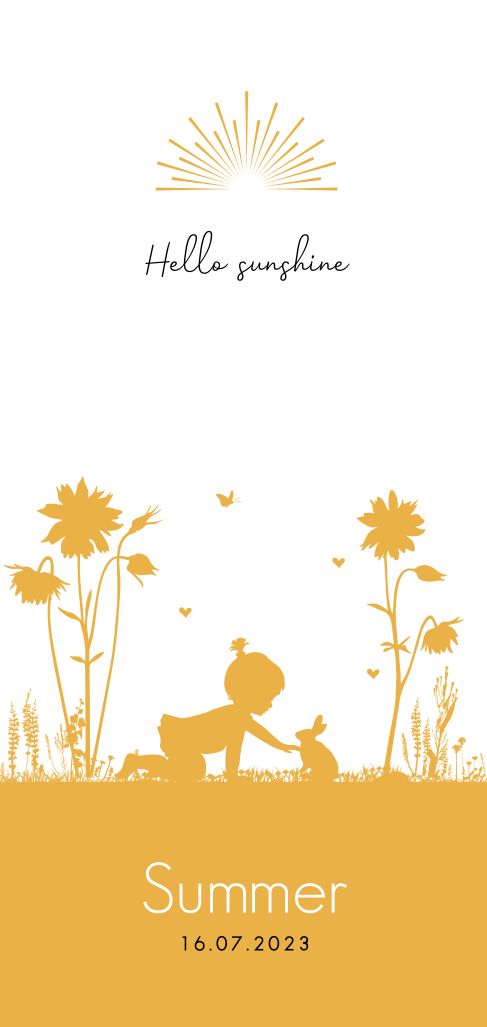 Zomers geboortekaartje in wit met geel met het silhouet van een klein meisje dat buiten in het gras kruipt tussen vrolijke zonnebloemen. De zonnestralen geven een leuk effect. Pas dit kaartje Summer naar je eigen smaak aan in de editor.