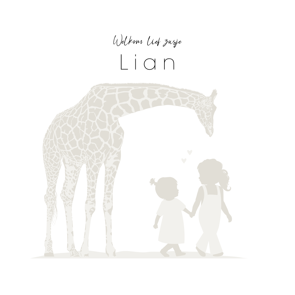 Meisjes geboortekaartje met trendy bruine ton sur ton kleuren. Dit geboortekaartje is perfect voor een tweede kindje. Op dit meisjeskaartje Lian zie je een grote giraffe gebogen over twee meisjes die hand in hand lopen, en grote zus en klein zusje. Teksten, kleuren en silhouetten kun je eenvoudig aanpassen in de editor. Dit geboortekaartje is ook mogelijk voor een andere gezinssamenstelling.