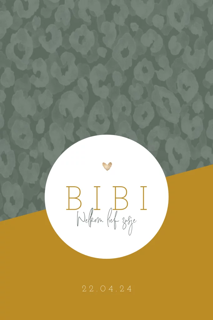 Dit stoere geboortekaartje is voor een stoer meisje. De dierenprint op de achtergrond geeft de kaart een extra stoer uitstraling. Het zwart witte tijgerprint samen met de groene en roze kleur maakt dit kaartje met de naam Bibi helemaal af.