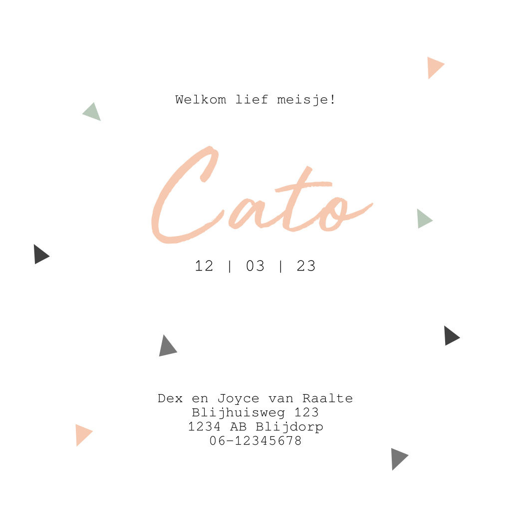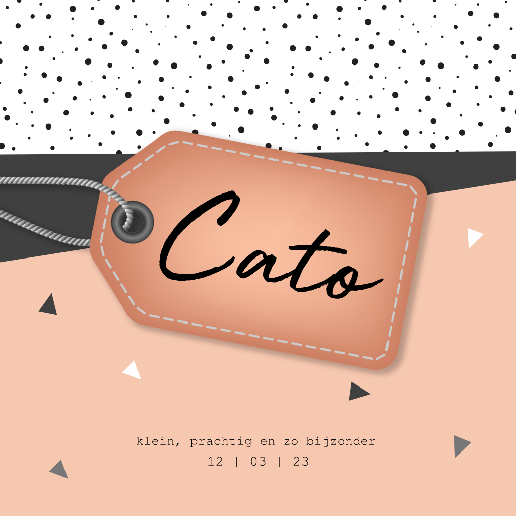 Stoer en geometrisch meisjeskaartje met een groot label waarop de babynaam staat. Dit geboortekaartje Cato heeft geometrische vlakken en een stippen patroon. De gebruikte kleurencombinatie is zwart met wit en peach. De kleine driehoekjes maken het kaartje compleet.