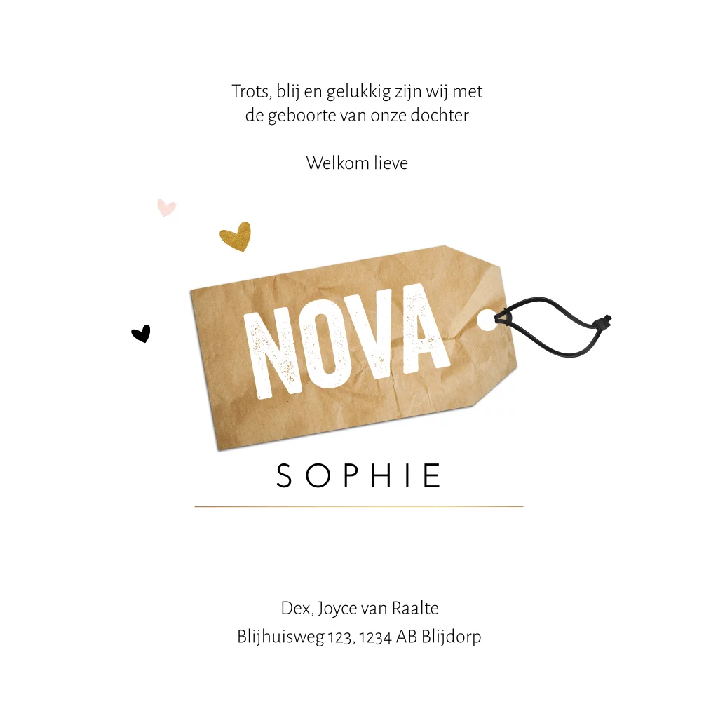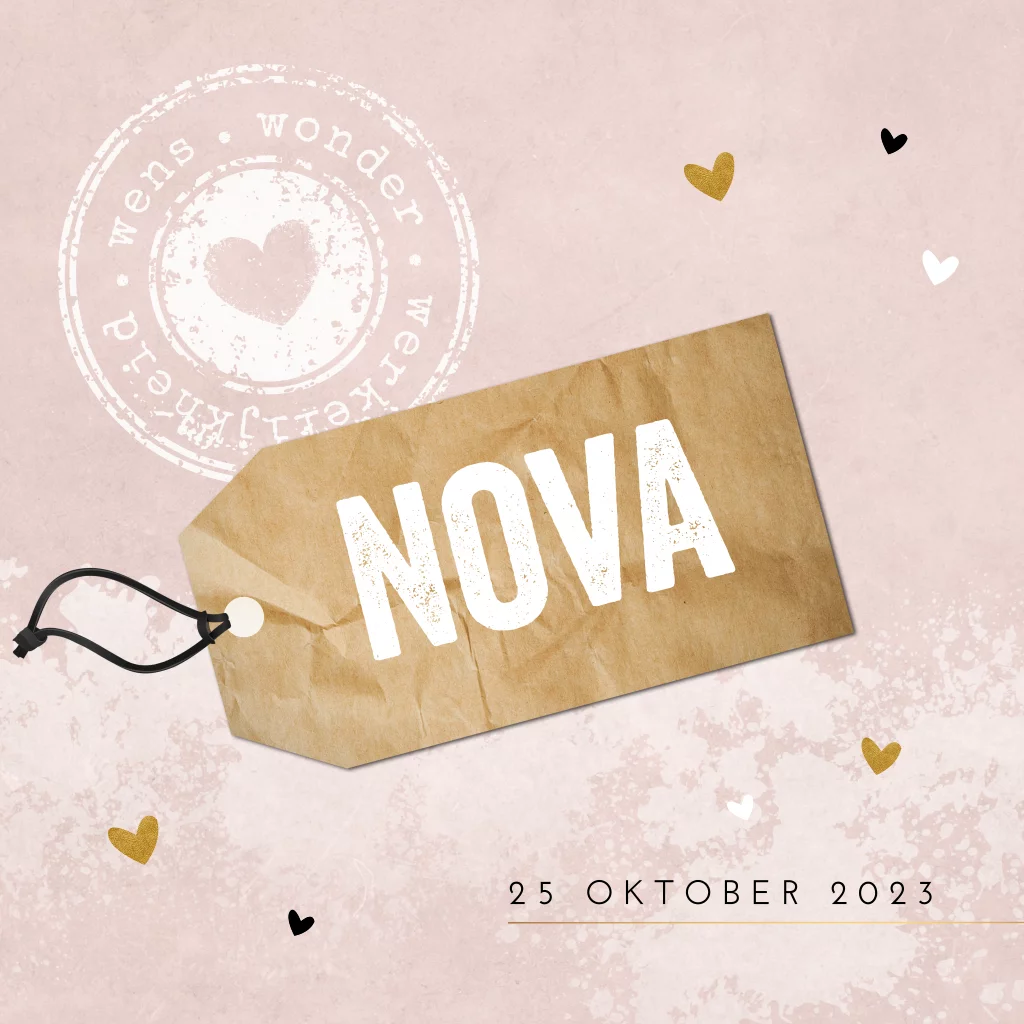 Stoer geboortekaartje voor een dochter. Dit meisjeskaartje heeft een oud roze betonlook achtergrond, een stempel met tekst en een afbeelding van een papieren label waarop de babynaam Nova staat. De kleine hartjes maken dit kaartje af. Teksten en kleuren zijn aan te passen in de editor.