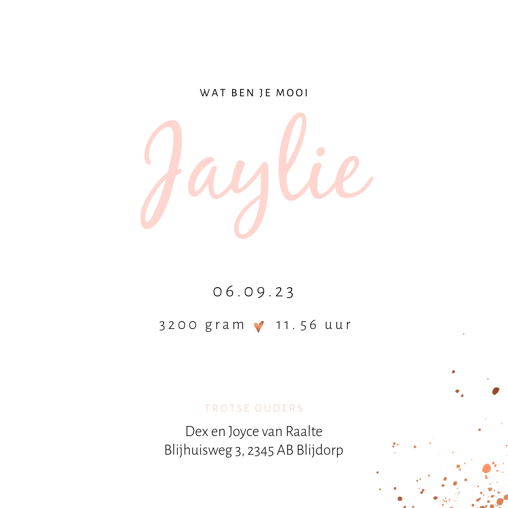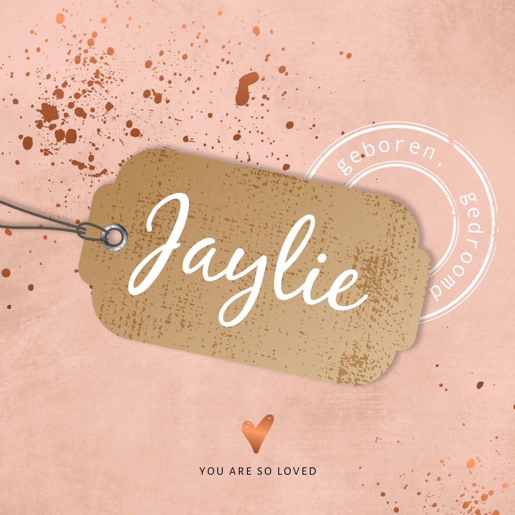 Stoer geboortekaartje voor een meisje. Dit kaartje Jaylie heeft een oud roze en ruwe achtergrond met koperkleurige accenten, waaronder een hartje en spetters. De babynaam staat op een label. Achter het label een een stempel. Kleuren en lettertypes zijn aan te passen in de editor.