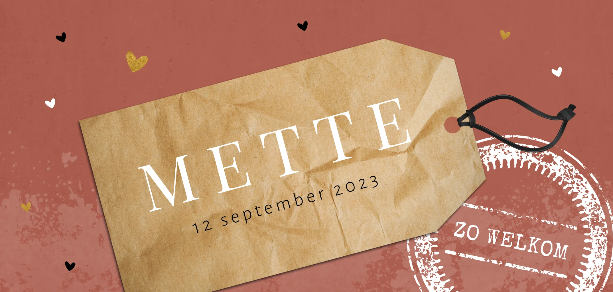 Stoer geboortekaartje voor een dochter. Dit meisjeskaartje heeft een warme rode betonlook achtergrond, een stempel met tekst en een afbeelding van een papieren label waarop de babynaam Mette staat. De kleine hartjes maken dit kaartje af. Teksten en kleuren zijn aan te passen in de editor.