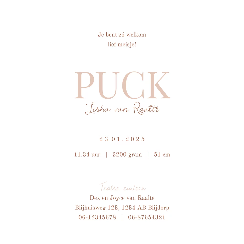 Basic geboortekaartje voor een meisje met de kleur oudroze en een leren label op de voorzijde. Liever een andere kleur dan oud roze op de kaart? Deze kaart is gemakkelijk aan te passen in onze editor.