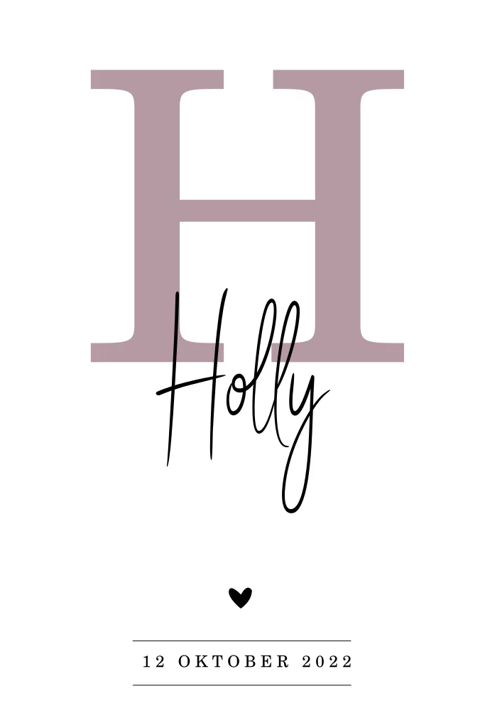 Mooi geboortekaartje waarbij de eerste letter van de naam in een strakke letter op het kaartje staat. De naam staat er in een geschreven lettertype doorheen