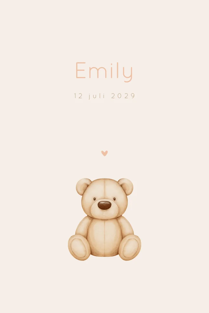 Goedkoop meisjes geboortekaartje Emily met schattig teddybeertje. De achtergrond is beige waardoor dit kaartje ook prima voor een jongen kan.
