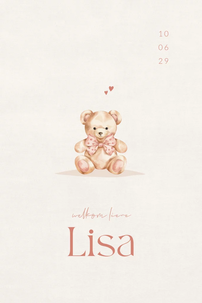 Lief geboortekaartje voor een meisje met een aquarel geschilderde knuffel, een schattige teddybeer met roze strik. Dit geboortekaartje Lisa heeft zachte tinten en afgeronde hoeken voor een speels effect. Pas dit geboortekaartje naar je eigen smaak aan in de editor en combineer met een mooie oudroze envelop om het helemaal af te maken.
