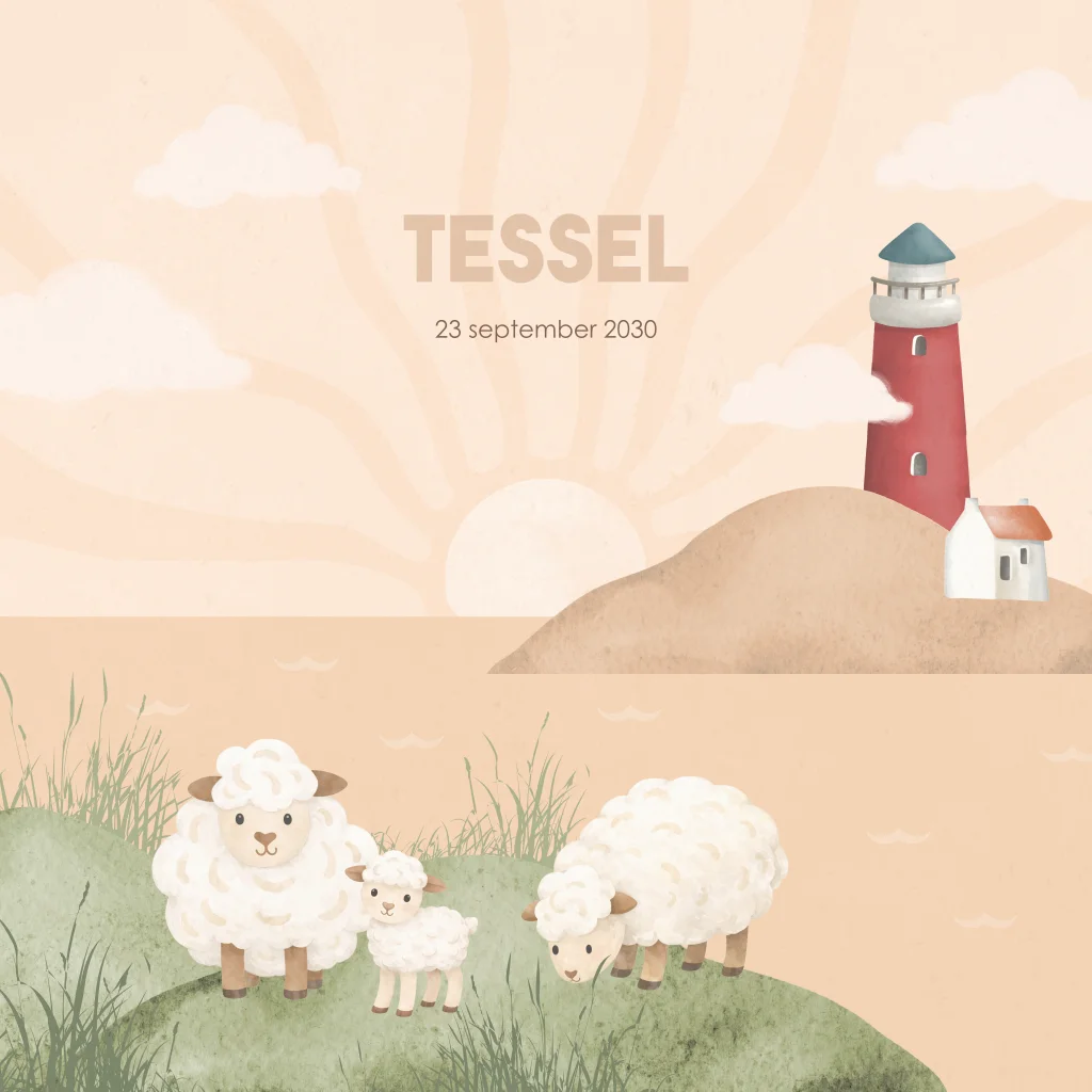 Gek van Texel of de Waddeneilanden? Dan is dit geboortekaartje met vuurtoren en schapen een perfecte keuze! Op dit geboortekaartje Tessel zie je de zee met de zon en grazende schaapjes op het droge. Alles is geheel naar eigen wens aan te passen in de editor. Hulp nodig? Ons team staat voor je klaar.