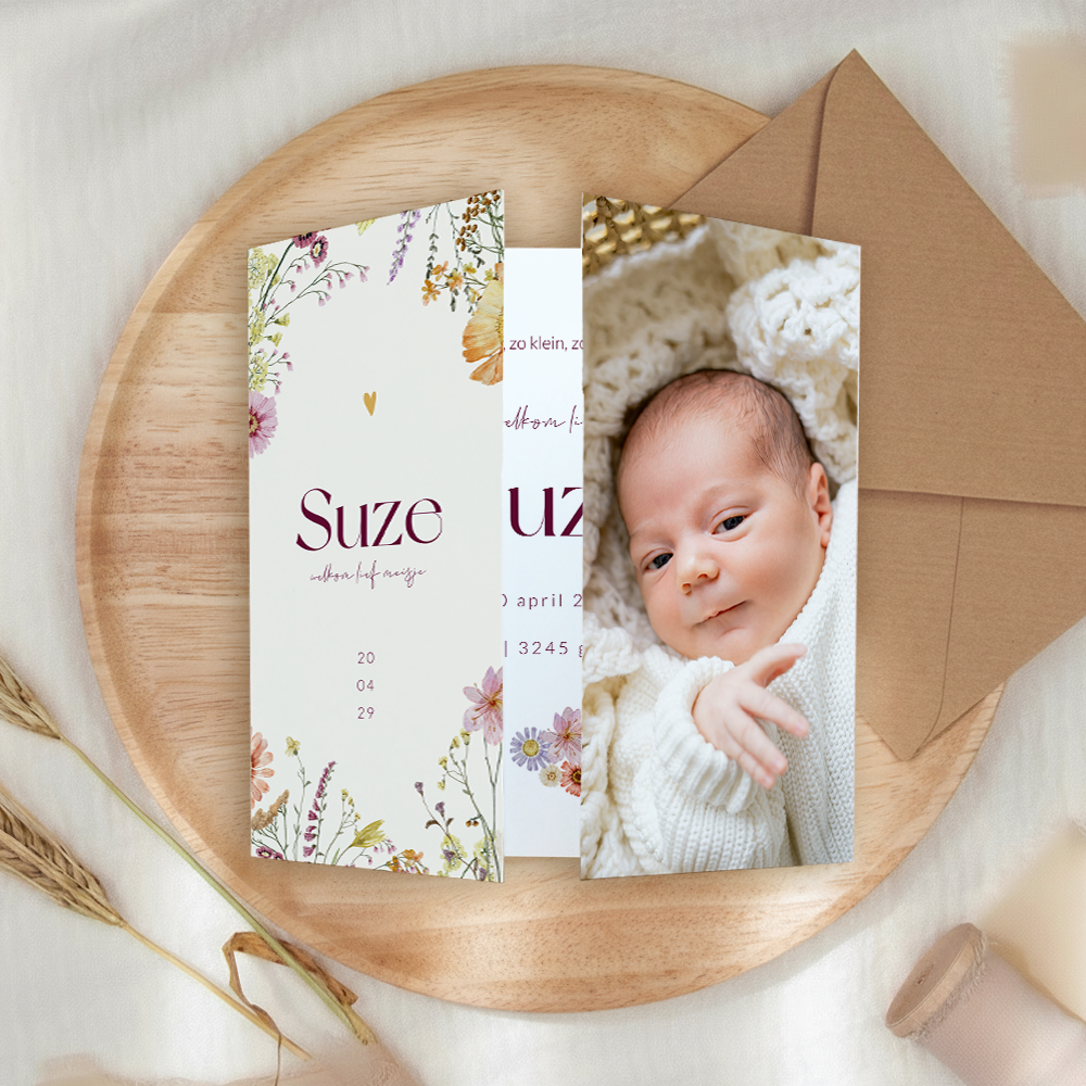 Prachtig bloemen geboortekaartje voor een meisje. Dit meisjes geboortekaartje Suze heeft een bijzondere theatervouw met deurtjes. Zet op het ene deurtje een lieve foto van jullie pasgeboren dochter. Het andere luikdeurtje is voorzien van prachtige gekleurde bloemen. Op de binnenzijde is ruimte voor de overige informatie. Sluit dit luikkaartje met een mooie gouden paperclip.