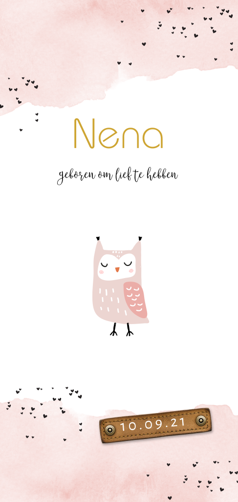 Meisjes geboortekaartje met een roze uiltje en met aquarel watercolor achtergrond, hartjes en leren label op de voorkant. Op de achterkant van het babykaartje Nena staan de geboortegegevens ook in leren labeltjes. Super leuk geboortekaartje met lief uiltje voor een dochter welke gemakkelijk is aan te passen.