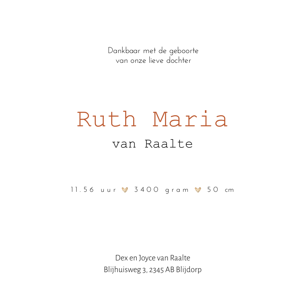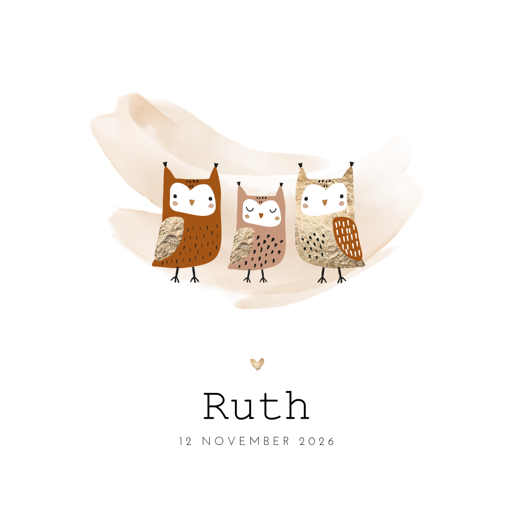 Lief christelijk dieren geboortekaartje voor een dochter met familie uil. Op dit meisjeskaartje Ruth staan 3 lieve uiltjes in mooie trendy kleuren. Achter de uilen een aquarel veeg in een zachte roze kleur. Verder is het kaartje overwegend wit en heeft daardoor een rustige uitstraling. Aan de binnenkant van dit geboortekaartje staat een bijbelse tekst.