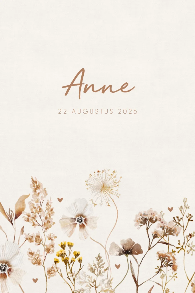 Meisjes geboortekaartje met mooie aquarel veldbloemen en een lichte linnen achtergrond. Dit babykaartje Anne heeft een rustige uitstraling en kun je naar je eigen smaak aanpassen.