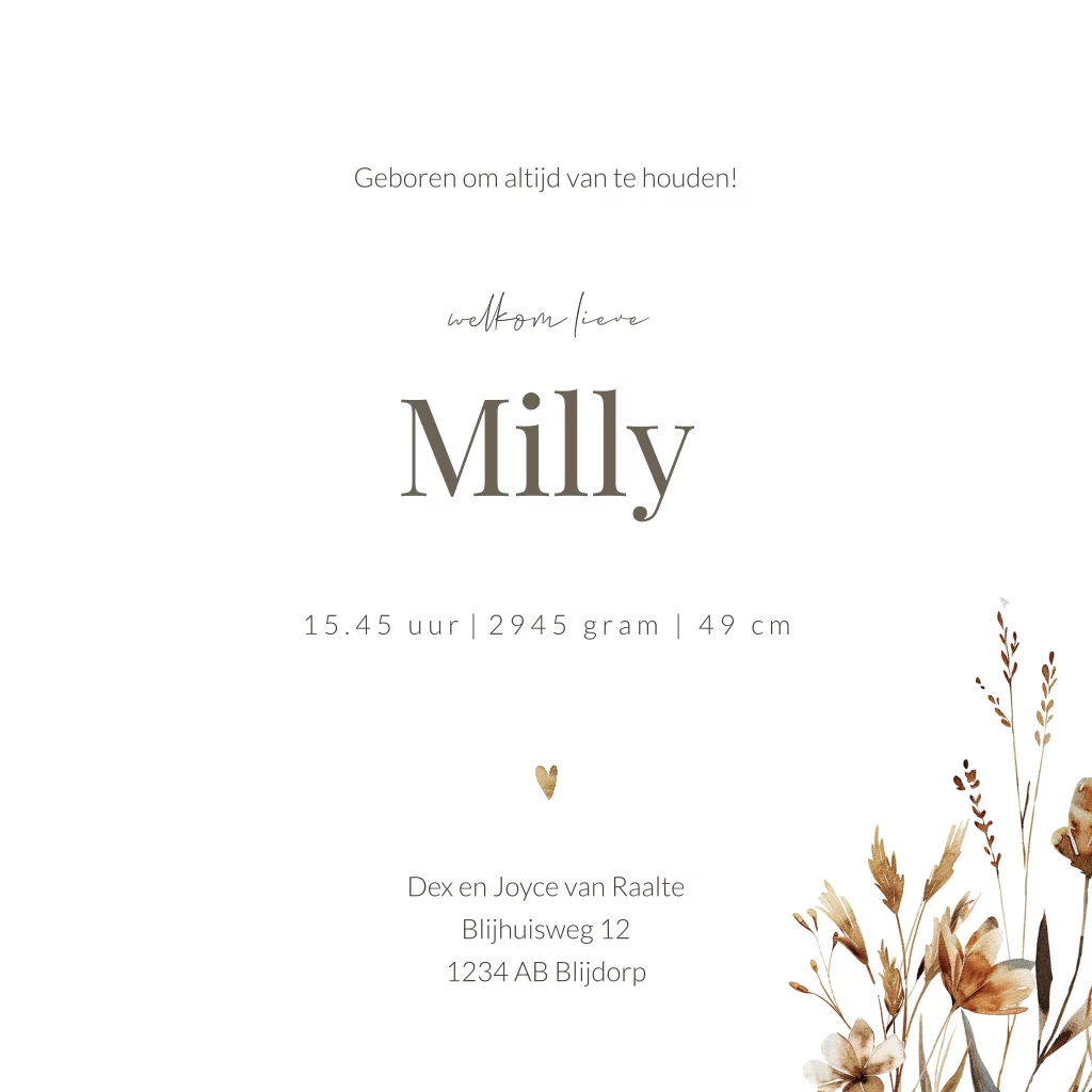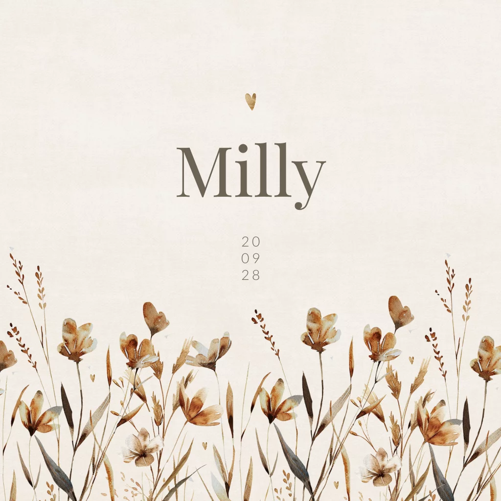 Dit prachtige aquarel geboortekaartje Milly is ontworpen voor een meisje. Het geboortekaartje is beige van kleur en heeft prachtige veldbloemen als ontwerp. Pas de naam Milly aan in de online editor naar de naam van jullie dochter en geniet van jullie kaartje. Het kleine subtiele hartje boven de naam van jullie meisje maakt het kaartje helemaal af.