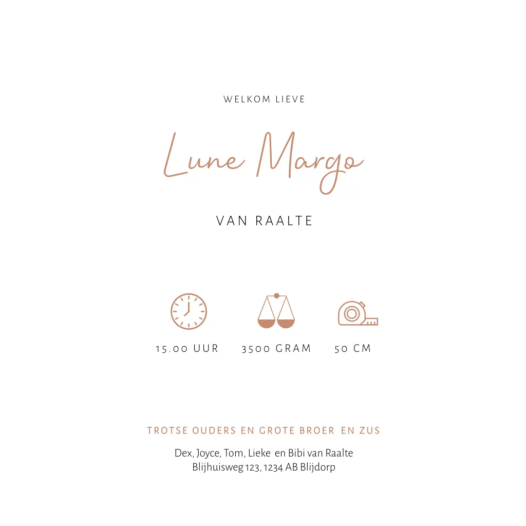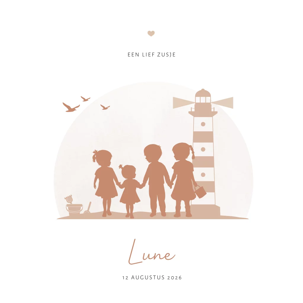Silhouet geboortekaartje voor een vierde kindje, een meisje. Op dit meisjeskaartje Lune staan 4 kindjes hand in hand op het strand bij een vuurtoren. In het zand een emmertje en schepje en op de achtergrond een aquarel. Pas dit kaartje naar je eigen smaak aan in onze editor.