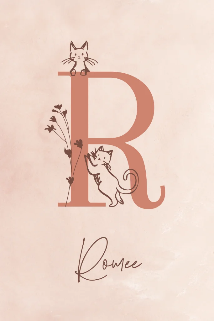 Prachtig uniek geboortekaartje voor een meisje. Op dit geboortekaartje Romee staat in het groot de voorletter van jullie kleine meisje met daarop een illustratie van katten en bloemen. Het kaartje heeft een roze aquarel achtergrond wat een mooie combinatie is met de rest van het geboortekaartje. Pas deze kaart naar je eigen smaak aan in onze ontwerpmodule.