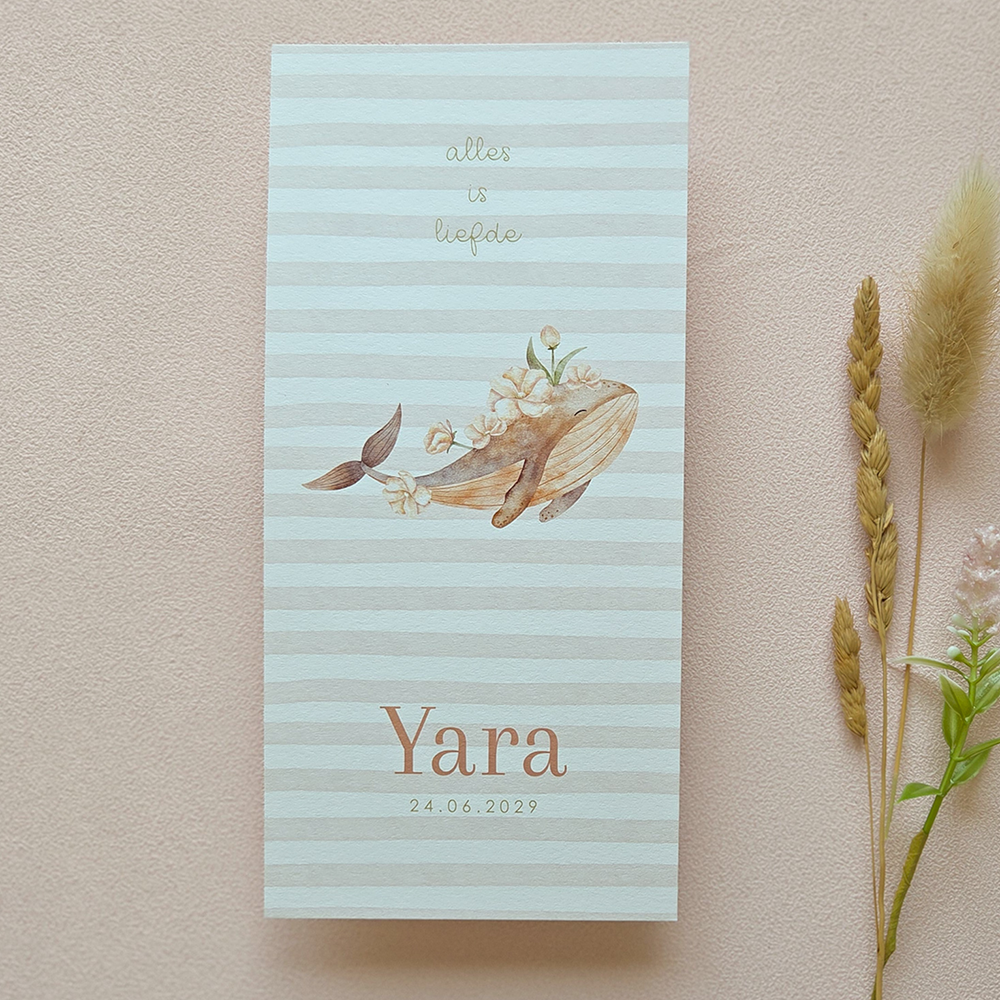 Geboortekaartje voor een meisje met strepen en een walvis met bloemen. Dit geboortekaartje Yara heeft een apart design waardoor deze zeker zal opvallen. Pas de kleur van de strepen eenvoudig aan in de editor. Hulp nodig met ontwerpen? Ons team helpt je graag.