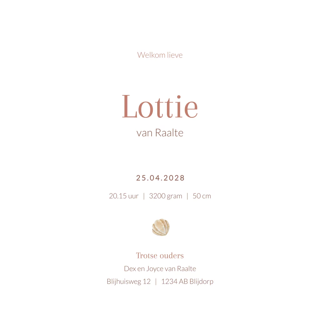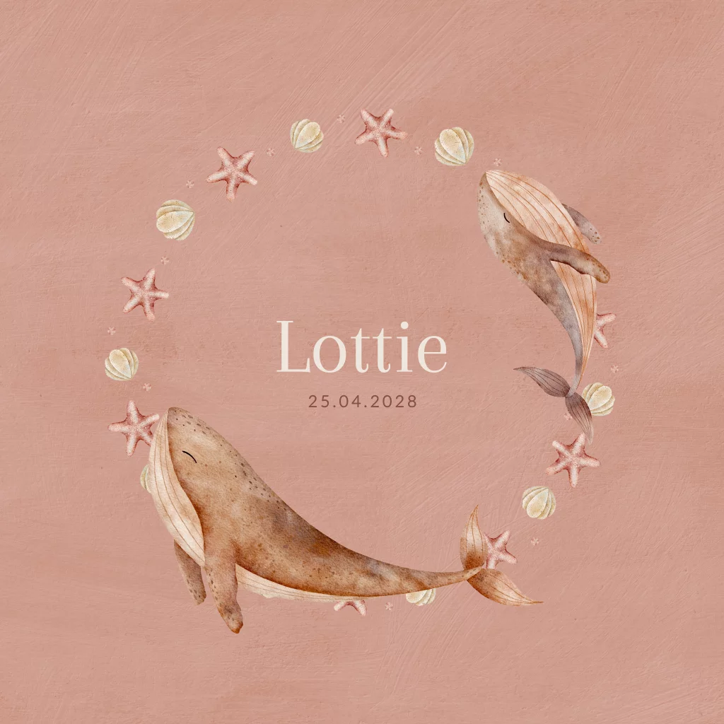 Zeedieren geboortekaartje voor een meisje. Op dit geboortekaartje Lottie zie je een walvis moeder met haar kind met zeesterren. Dit meisjeskaartje heeft een mooie roze betonlook achtergrond. Het design is anders dan anders en valt daarom extra op. Dit geboortekaartje is perfect als je van de zee en dieren houdt. Pas dit geboortekaartje eenvoudig aan in de editor.