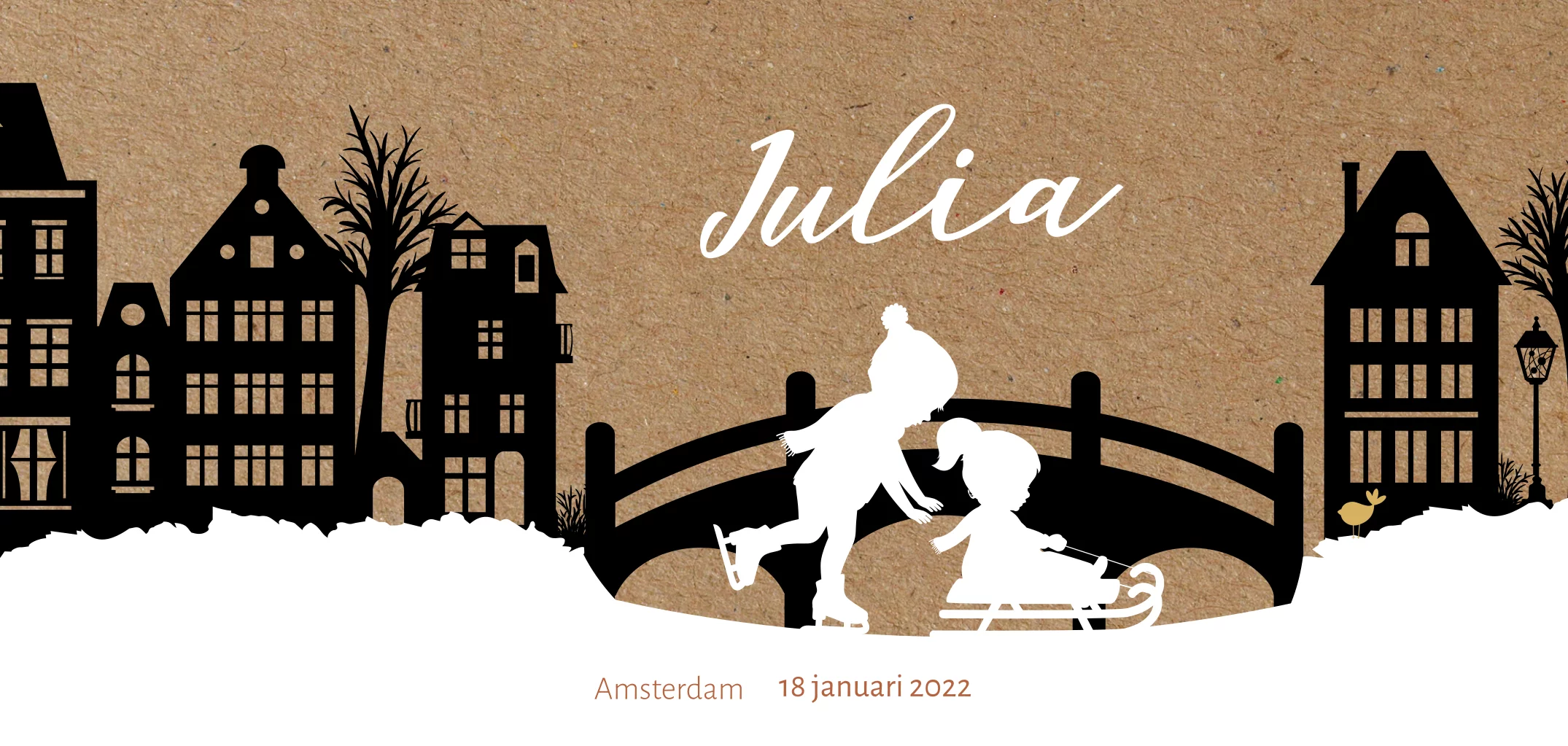 Silhouet geboortekaartje in winterse sfeer voor een dochter. Een grote broer op schaatsen duwt zijn kleine baby zusje die op de slee zit. Op de kartonnen achtergrond staan huisjes sneeuw en een brug. De kleuren en silhouetten van dit babykaartje Julia zijn aan te passen.