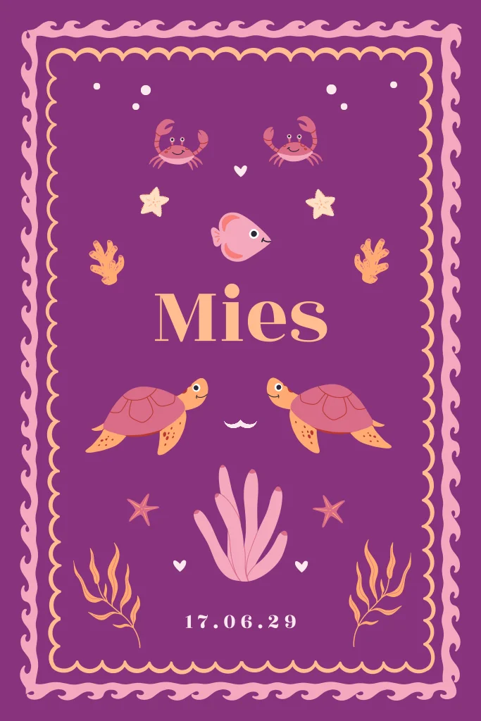 Dit kleurrijke unieke geboortekaartje voor een meisje met zeedieren is de perfecte manier om de geboorte van jullie dochtertje aan te kondigen. Op dit kaartje Mies zie je schattige zeedieren zoals schildpadden, een visje, zeesterren en krabbetjes. De afgeronde hoeken en het golvende kader geven een speels effect aan dit geboortekaartje voor jullie meisje. Dit kaartje met een schattig onderwaterwereld thema kan eenvoudig aangepast worden in onze online editor.