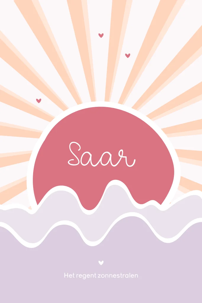 Een vrolijk geboortekaartje voor een meisje. Dit geboortekaartje Saar voor jullie dochter heeft een kleurrijk design met een zon, hartjes en golvend water. Op dit kaartje staat de tekst 'Het regent zonnestralen'. Pas alles geheel naar eigen wens aan in de editor. Hulp nodig? Ons team staat voor je klaar.