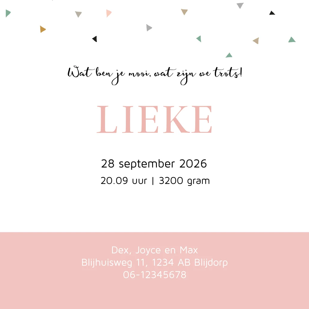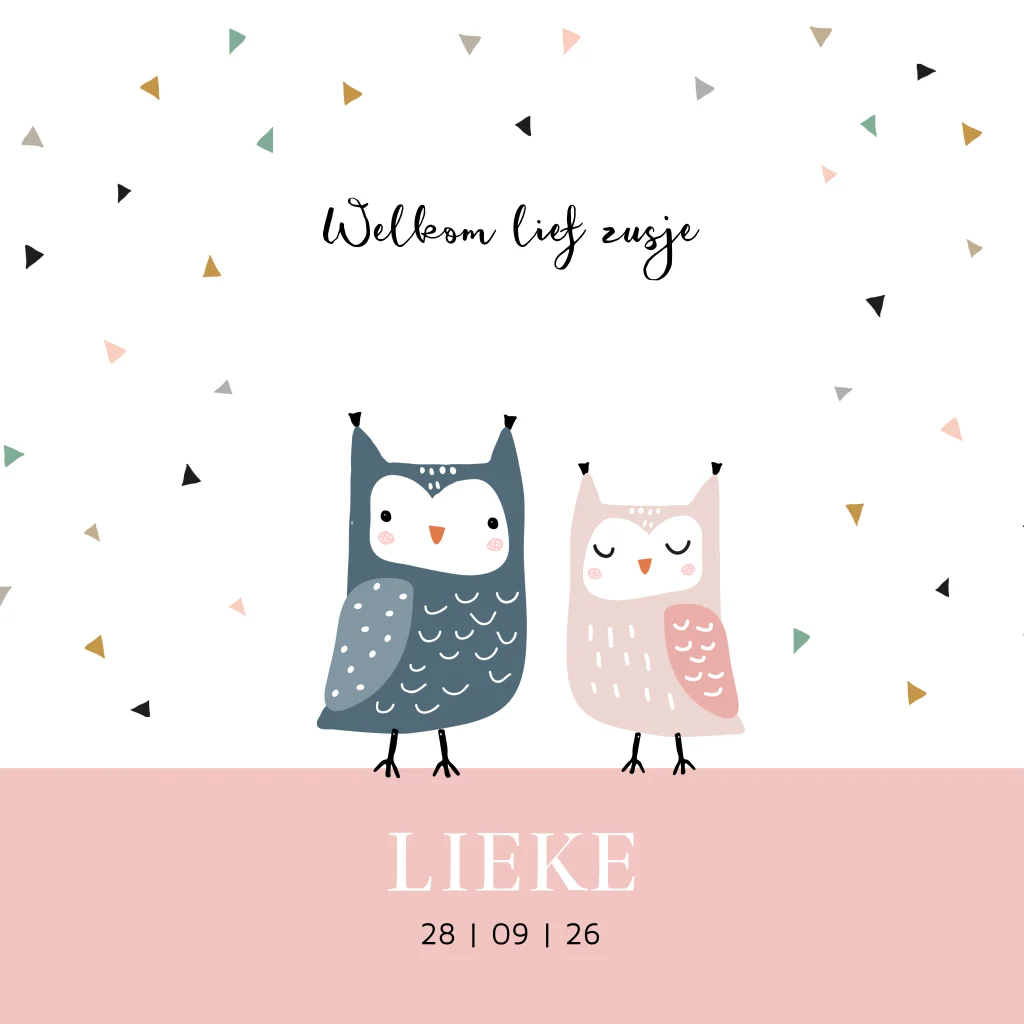 Een vrolijk geboortekaartje voor een baby zusje en een grote broer. Op dit leuke babykaartje staan twee uiltjes, dus super geschikt voor een tweede kindje. De vrolijke driehoekige confetti maakt deze kaart Lieke helemaal af. Het ontwerp is gemakkelijk aan te passen.