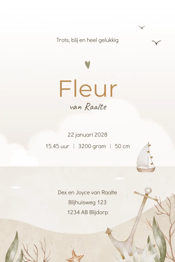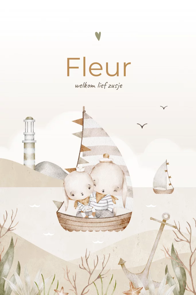 Op zoek naar een uniek geboortekaartje? Bekijk dan snel dit geboortekaartje voor een meisje. Dit geboortekaartje Fleur is perfect voor een tweede kindje, een zusje! Je ziet twee konijntjes op een bootje, een grote zus met haar kleine zusje. Ze varen op de zee. Op de achtergrond zie je het strand met een vuurtoren. Pas de teksten, kleuren en lettertypes eenvoudig aan in de editor.