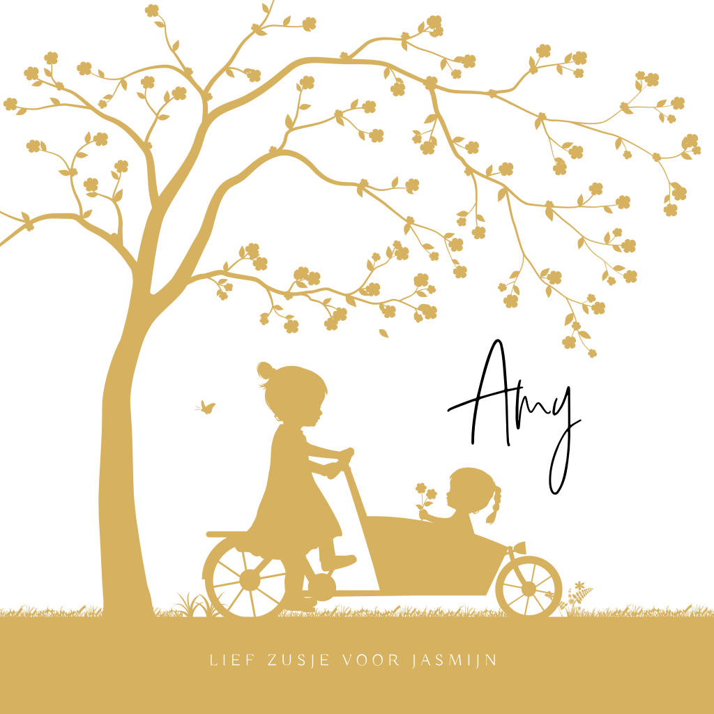 Lief silhouet geboortekaartje voor een tweede dochter. Op dit babykaartje met de naam Amy staat een grote zus op de bakfiets met voorin haar kleine baby zusje. De mooie boom, bloempjes en kleine vlindertjes maken het kaartje helemaal af. Dit silhouet kaartje is gemakkelijk aan te passen en ook mogelijk in een andere gezinssamenstelling.
