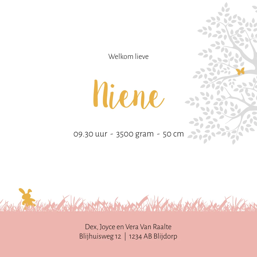 Geboortekaartje in een stadse omgeving met een silhouet van een grote zus hand in hand met haar kleine zusje. Dit geboortekaartje Niene is voor een tweede kindje, maar ook andere combinaties zijn mogelijk. Overige elementen op deze kaart zijn een knuffeltje, bankje, boom en lantaarn. De kleuren op dit kaartje zijn aan te passen.