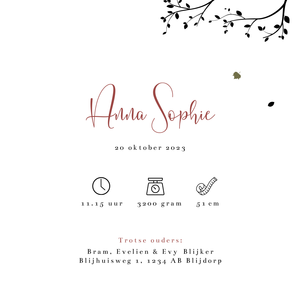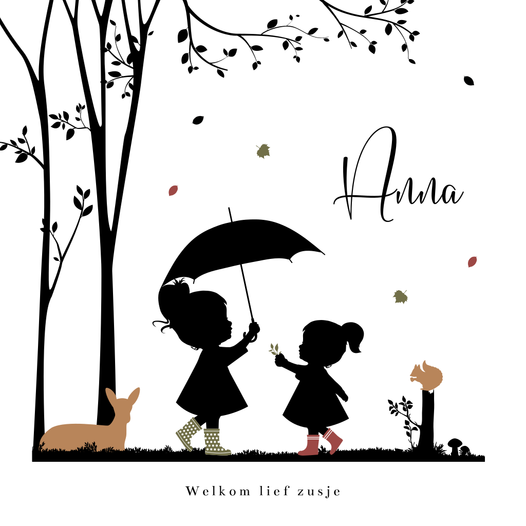 Herfst geboortekaartje voor een tweede kindje, een zusje. Op dit silhouet kaartje Anna staan 2 meisjes met gekleurde laarsjes en een paraplu onder een boom met dwarrelende blaadjes. Verder op dit kaartje een hertje, eekhoorn en paddenstoeltjes. Teksten en kleuren, evenals het silhouet zijn aan te passen in de editor. Ook mogelijk voor een andere gezinssamenstelling.