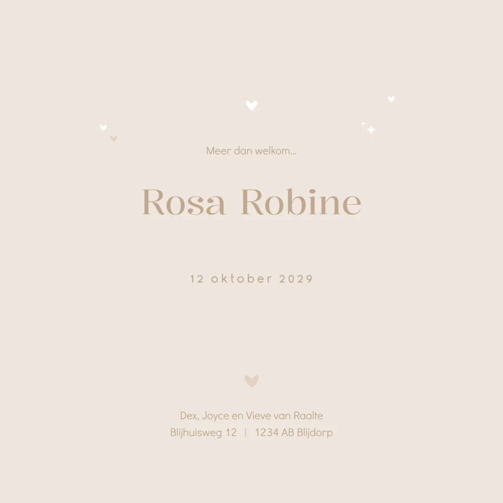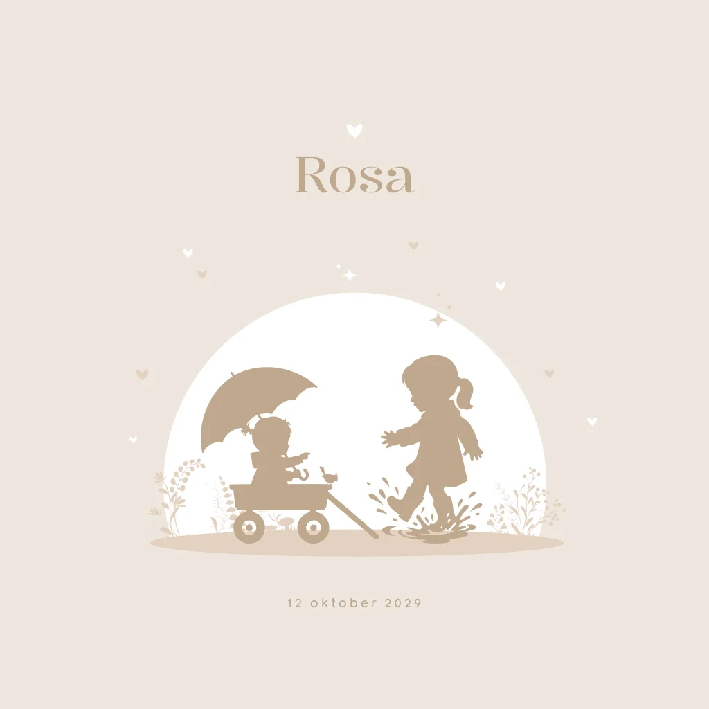 Silhouet geboortekaartje voor een meisje, een zusje. Op dit geboortekaartje Rosa zie je twee kindjes, een grote zus met haar kleine zusje. Ze spelen samen in de regen en de plassen, dit kaartje is daarom perfect voor een herfst baby. De baby zit in een karretje en heeft een paraplu vast. Op de zachtroze achtergrond staan hartjes. Een liefdevol silhouet kaartje voor een tweede kindje.