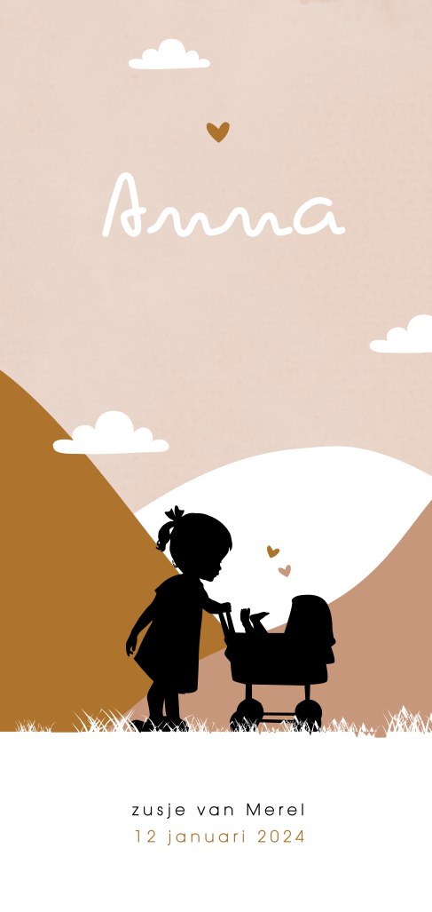 Hip silhouet geboortekaartje in trendy kleuren voor een tweede kindje, een dochter. Op dit meisjeskaartje Anna staat een grote zus die in de kinderwagen kijkt, waarin haar kleine baby zusje ligt. Op de achtergrond aquarel, bergen en wolkjes. Ook mogelijk met een ander silhouet of andere kleuren.