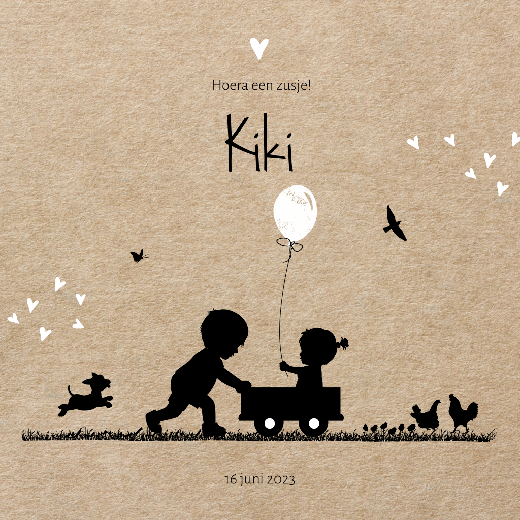 Vrolijk silhouet geboortekaartje voor een zusje op een karton achtergrond. Een mooie combinatie met zwart en wit. Op dit baby kaartje met de naam Kiki staat een grote broer samen met zijn kleine zusje. Het meisje zit in een karretje met een ballon in haar hand. De hartjes, vlindertje, hondje en de kippen met de kuikentjes maken dit kaartje helemaal af! Dit silhouet kaartje is gemakkelijk aan te passen en ook mogelijk in een andere samenstelling.