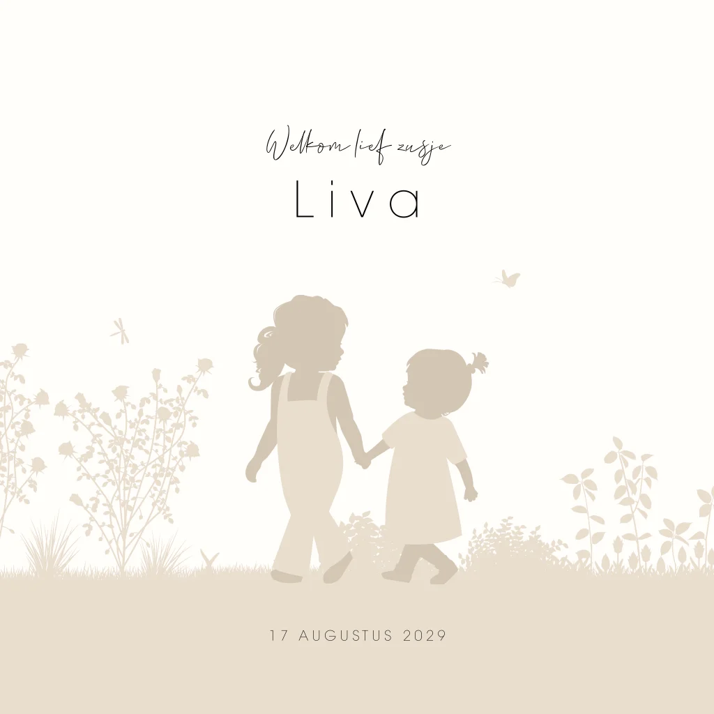 Geboortekaartjes voor een meisje, een tweede kindje, in zachte aardetinten. Op dit meisjes geboortekaartje Liva een silhouet van twee zusjes met tuinbroek en jurkje, hand in hand tussen de bloemen. Dit geboortekaartje is perfect voor ouders die op zoek zijn naar iets unieks en rustigs. Teksten, kleuren en silhouetten zijn eenvoudig aan te passen in de editor, waardoor je het kaartje helemaal naar je eigen wens kunt maken. Ook mogelijk voor een andere gezinssamenstelling.