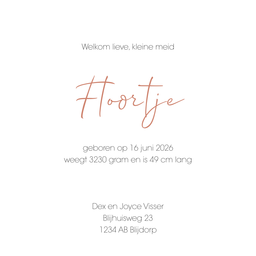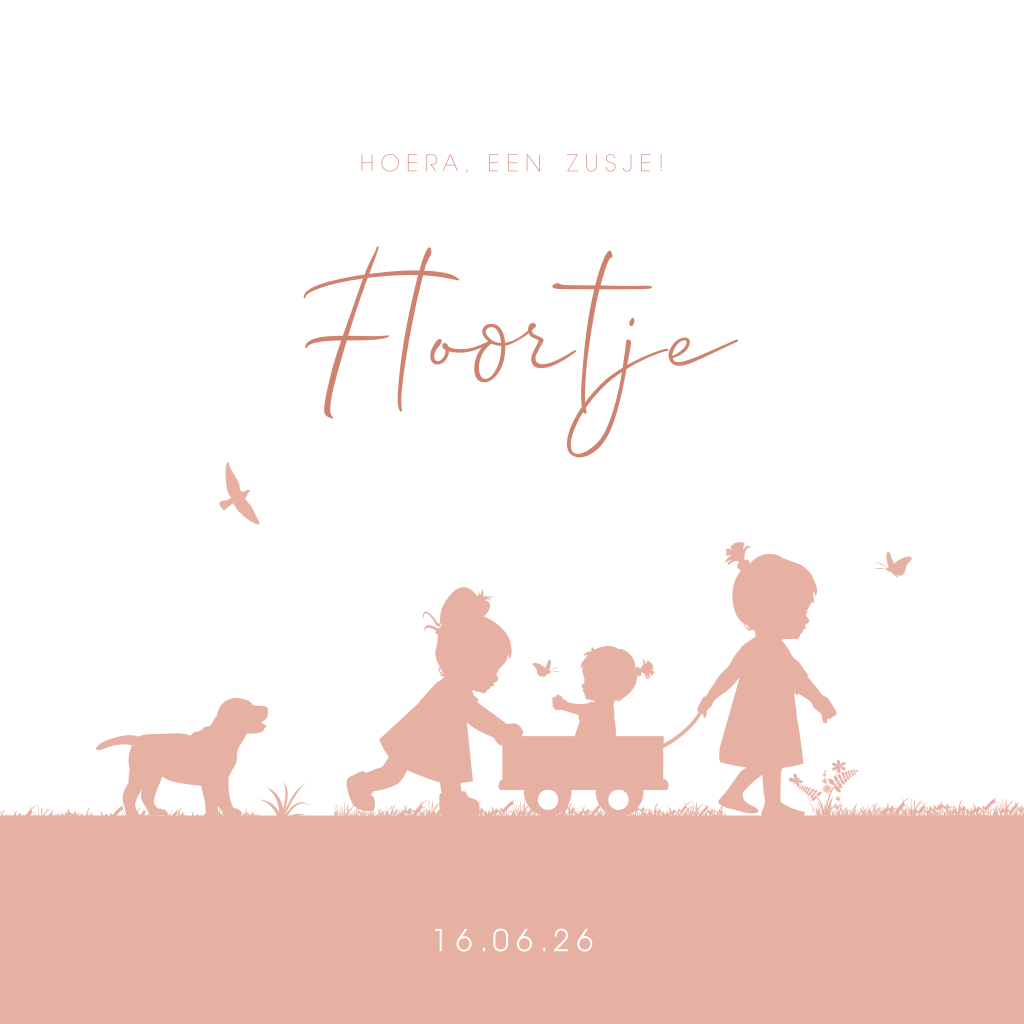 Lief silhouet geboortekaartje voor een derde dochter. Op dit babykaartje met de naam Floortje staan twee grote zussen samen met hun kleine baby zusje en een hondje. Het kaartje is overwegend wit met pastel roze en goudkleur. Dit silhouet kaartje is gemakkelijk aan te passen en ook mogelijk in een andere gezinssamenstelling.