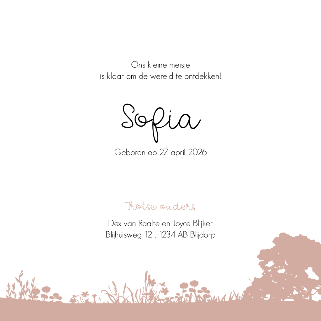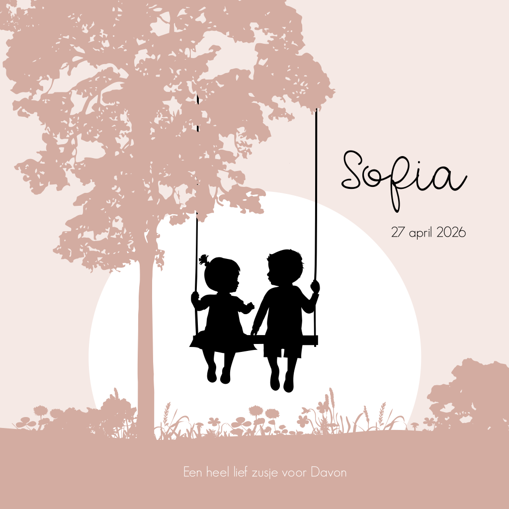 Lief silhouet geboortekaartje in trendy oudroze kleuren. Op dit kaartje Sofia zie je een broertje en zusje samen op de schommel zitten voor een grote witte zon. De kaart is speels met een boom en hoog gras met bloementjes. Teksten, kleuren en silhouetten kun je gemakkelijk aanpassen in de editor.
