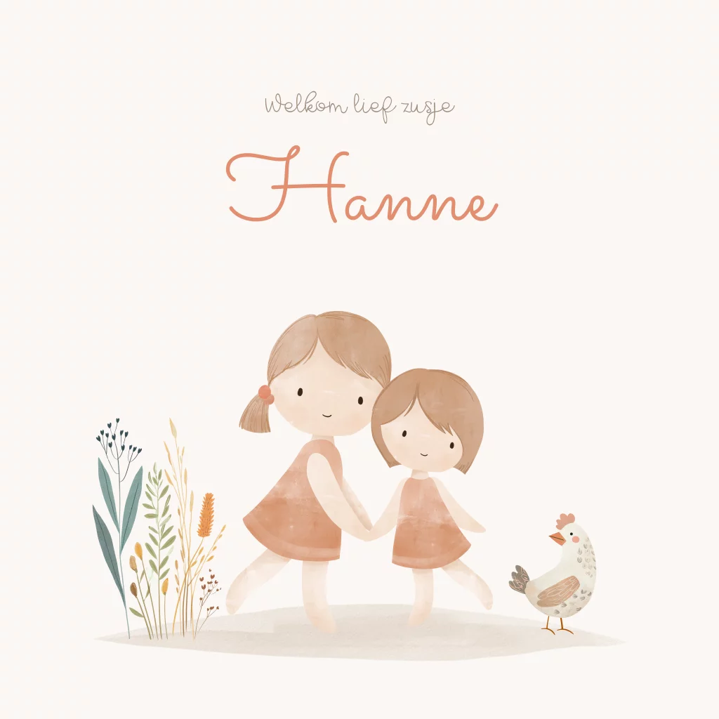 Uniek getekend geboortekaartje voor een tweede kindje, een zusje! Dit zusjes geboortekaartje Hanne heeft een lieve illustratieve uitstraling. Het kaartje is subtiel versierd met bloemen en een schattige getekende kip.