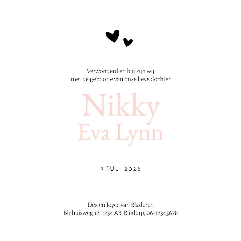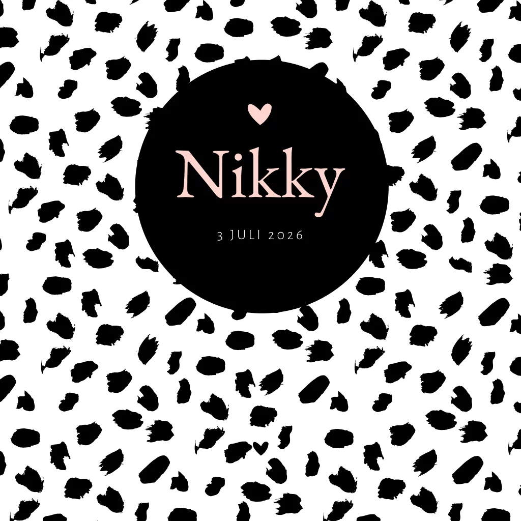 Hip en trendy geboortekaartje met op de achtergrond een dierenpatroon. Op deze kaart in zwart en wit staat de naam van de baby in een zwarte cirkel.