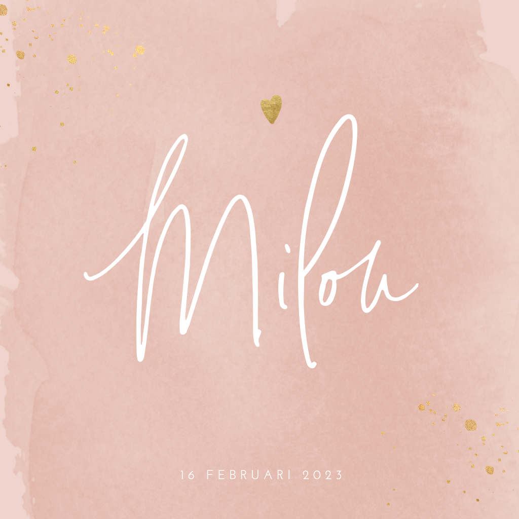 Hip geboortekaartje voor een meisje met een roze aquarel achtergrond en gouden spetters. De ronde hoeken maken dit kaartje Milou extra speciaal. Pas de teksten, kleuren en lettertypes naar je eigen smaak aan in de editor.