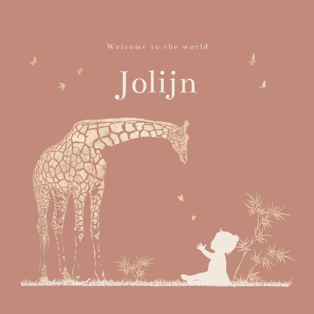 Hip, trendy geboortekaartje waarmee je iedereen kan laten weten dat jullie dochter is geboren. Op dit kaartje een meisje zittend in het gras, met een giraf en kleine gouden hartjes en vogels. De ronde hoeken maken dit prachtige kaartje Jolijn extra bijzonder. Pas de teksten, kleuren en lettertypes naar je eigen smaak aan in de editor. Zodat dit kaartje helemaal jullie eigen, perfecte geboortekaartje wordt!