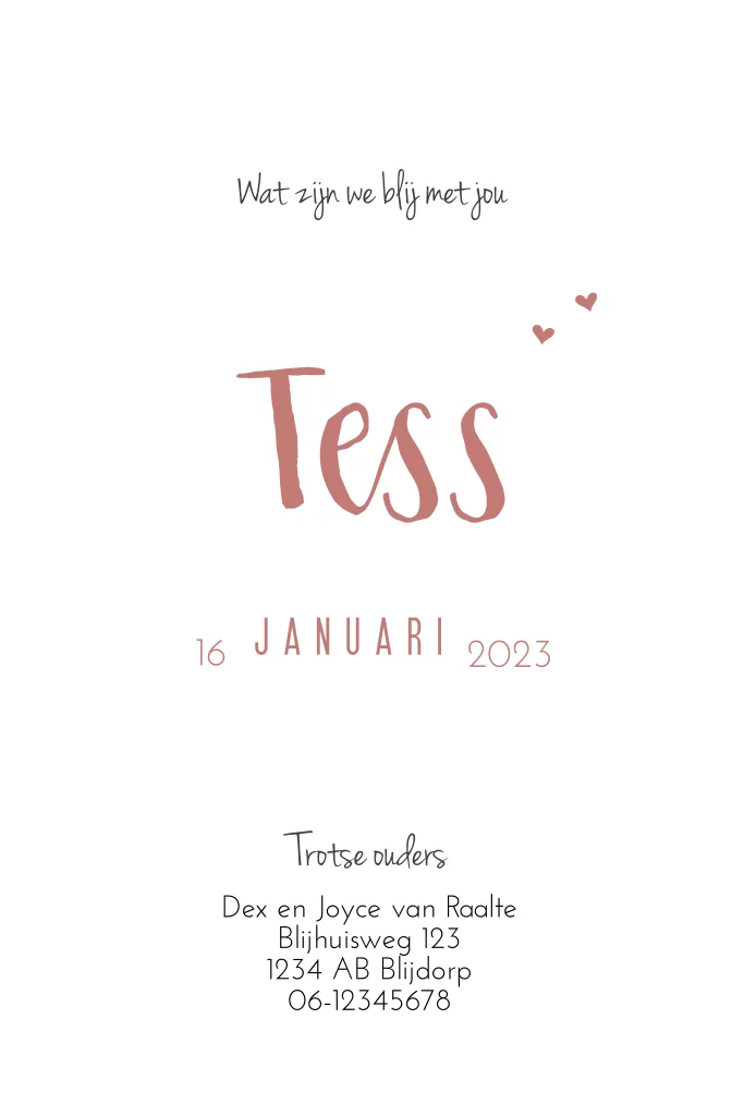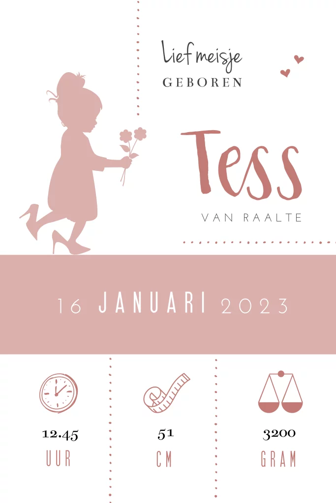 Handlettering en typografisch geboortekaartje met silhouet voor een dochter. Op dit kaartje Tess staat een meisje op hoge hakjes met lieve bloemetjes in haar hand. De geboorte symbolen staan op de voorkant van het kaartje en de hoofdkleur is oud roze.