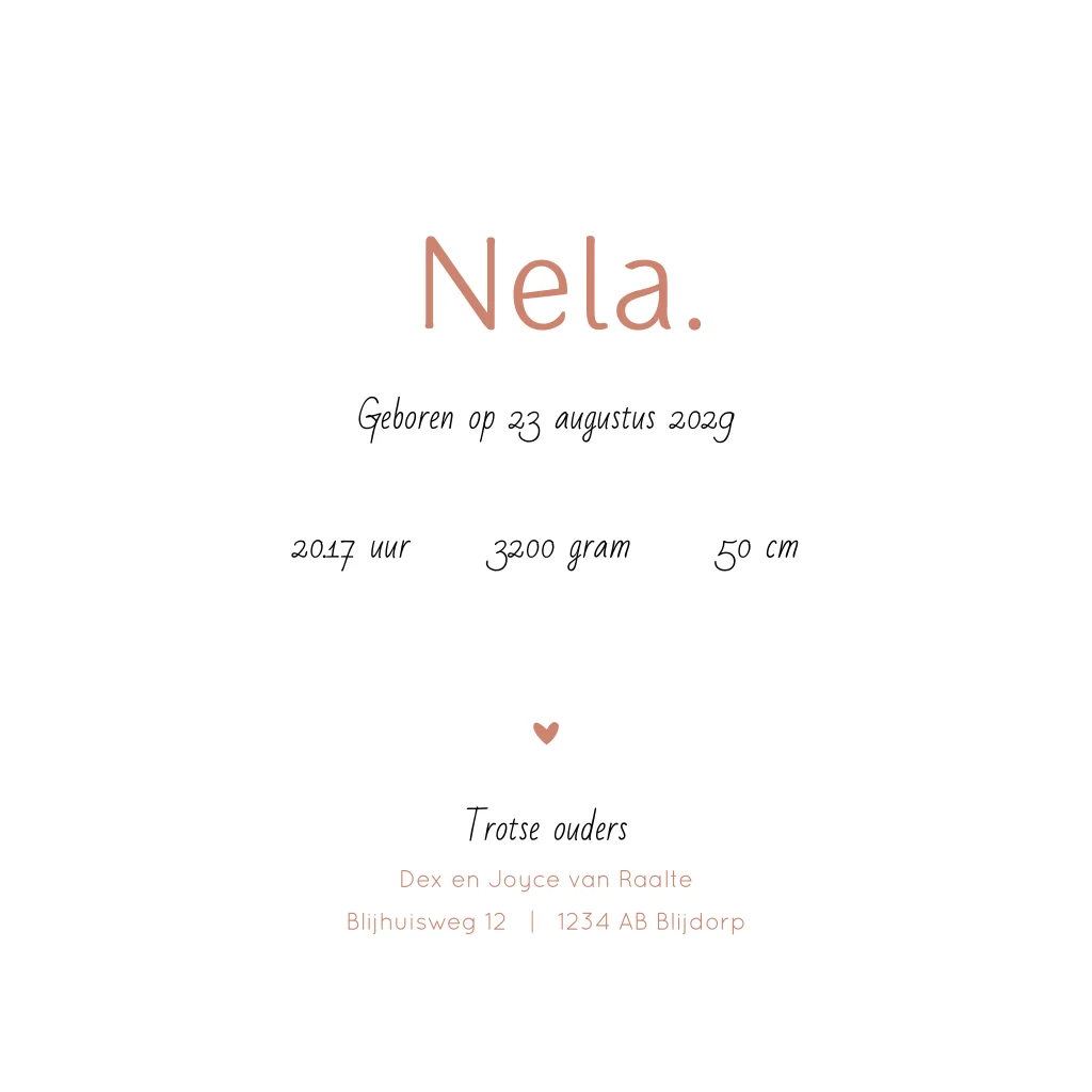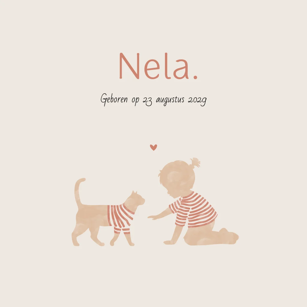 Silhouet geboortekaartje voor een eerste kindje, een meisje. Op dit baby kaartje met de naam Nela zie je een silhouet van een meisje met een kat. Het meisje en de kat hebben allebei een shirtje met streepjes aan en zijn met elkaar aan het spelen. Perfect voor ouders die hun huisdier willen betrekken bij het geboortekaartje! Dit silhouet kaartje is gemakkelijk aan te passen in de editor en ook mogelijk in een andere gezinssamenstelling.