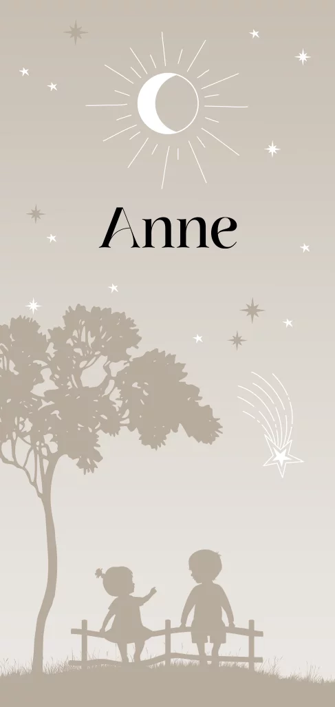 Op dit mooie beige silhouet geboortekaartje Anne zie je grote broer samen met zijn kleine zusje op een hek zitten. De kindjes bekijken de sterrenhemel die boven hun straalt. Je ziet de maan, een vallende ster en andere fonkelende sterren. Dit geboortekaartje heeft afgeronde hoeken en heeft een rustige beige tint als kleur. Maak dit geboortekaartje helemaal af met een bijpassende sluitzegel.