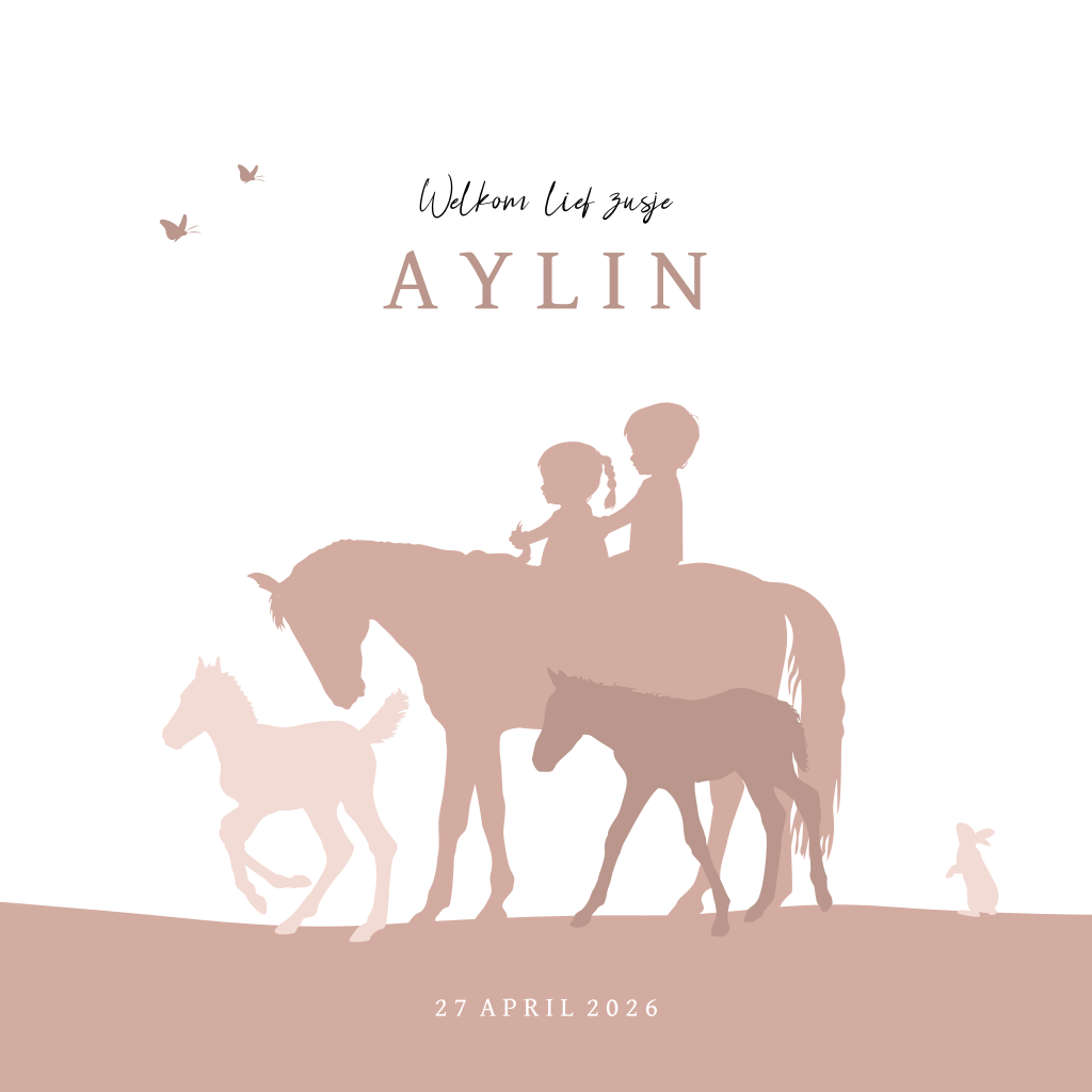 Silhouet geboortekaartje in roze ton-sur-ton kleuren voor een tweede kindje. Op dit meisjeskaartje Aylin zie je een grote broer met zijn kleine zusje op een paard rijden met kleine veulentjes ernaast. Op de achtergrond een lief konijntje en vlindertjes.