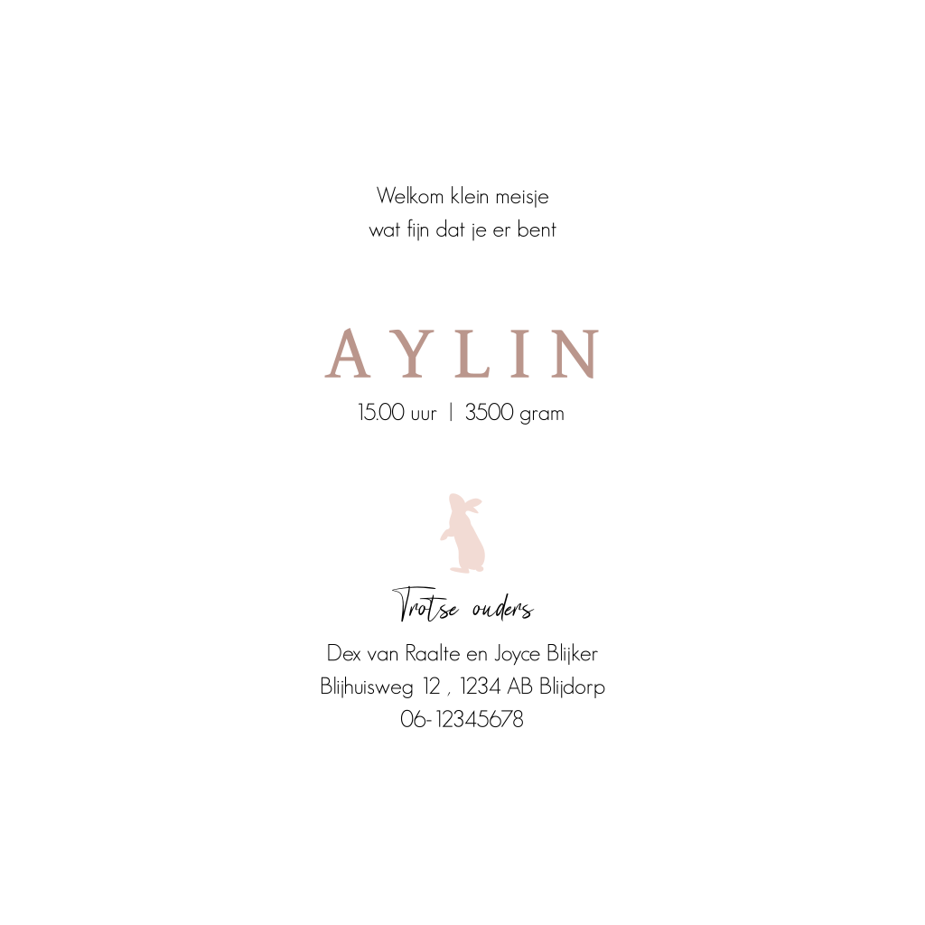 Teksten, kleuren en silhouetten kun je aanpassen in de editor. Dit geboortekaartje is ook mogelijk voor een andere gezinssamenstelling. Hulp nodig? We staan voor je klaar! Bel, mail of chat gerust.