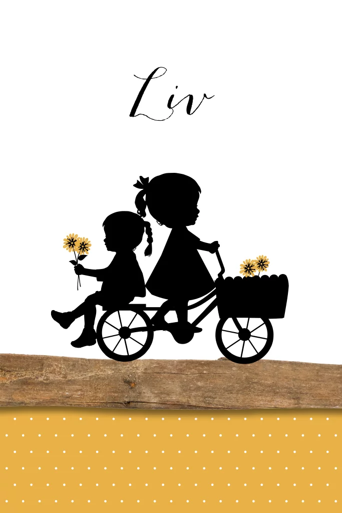 Babykaartje voor een tweede kindje. Op het kaartje staat een silhouet van een grote zus met een klein zusje achterop de fiets. Het baby zusje houdt bloemetjes in de hand. De geboortegegevens staan vermeld op de achterzijde in een hartje. De kaart is gedecoreerd met oker gele accenten, hout en fijne stipjes.