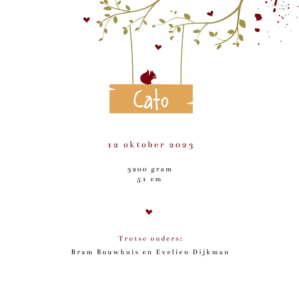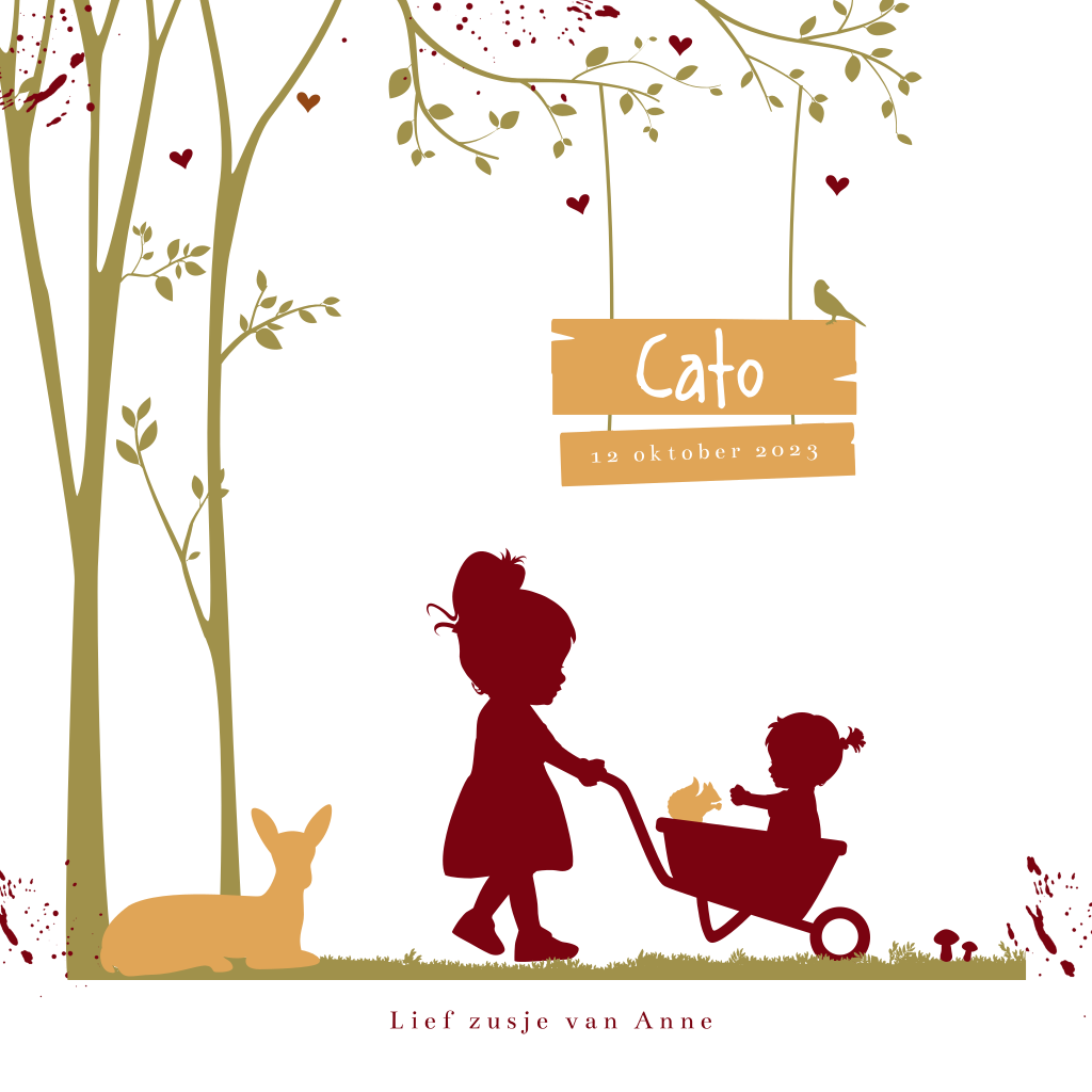 Herfst silhouet geboortekaartje voor een tweede kindje, een tweede dochter. Op dit meisjes kaartje Cato zie je 2 zusjes in het bos. De grote zus loopt met een kruiwagen waarin haar kleine baby zusje zit. Aan de takken van de boom hangt een bordje waarop de babynaam staat. Verder op dit kaartje een hert, egel, een vogeltje en enkele kleine hartjes. De teksten en kleuren zijn naar wens aan te passen. Ook mogelijk met een ander silhouet of voor een andere gezinssamenstelling.
