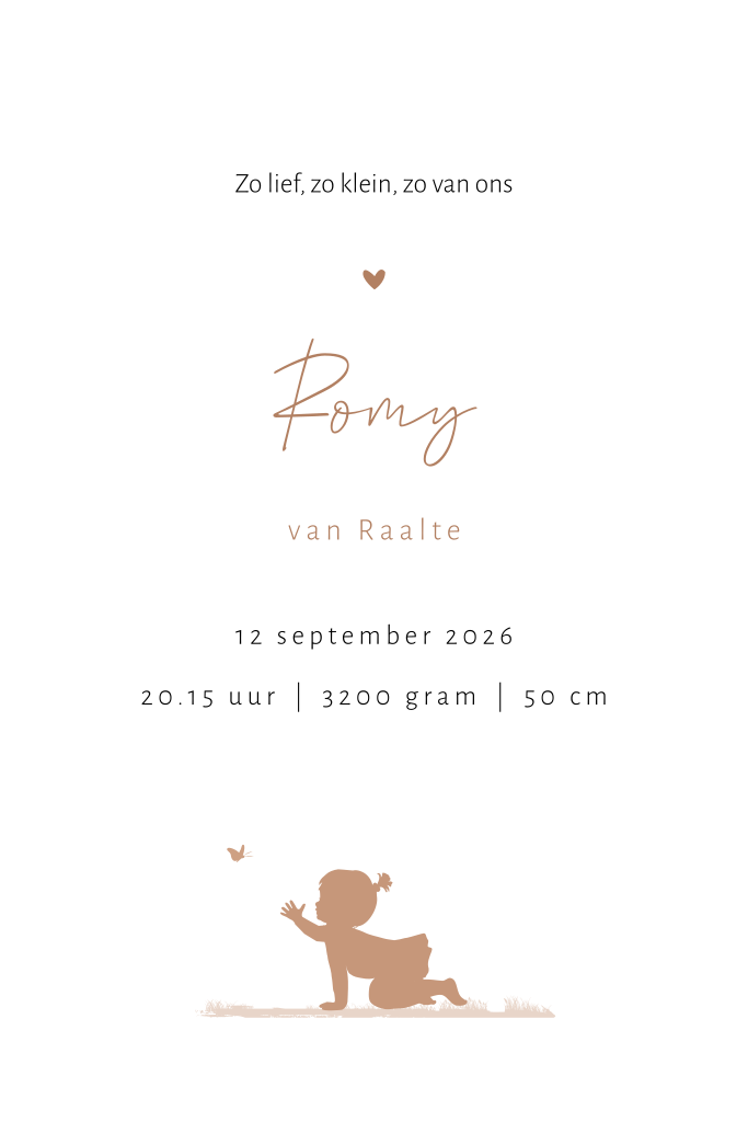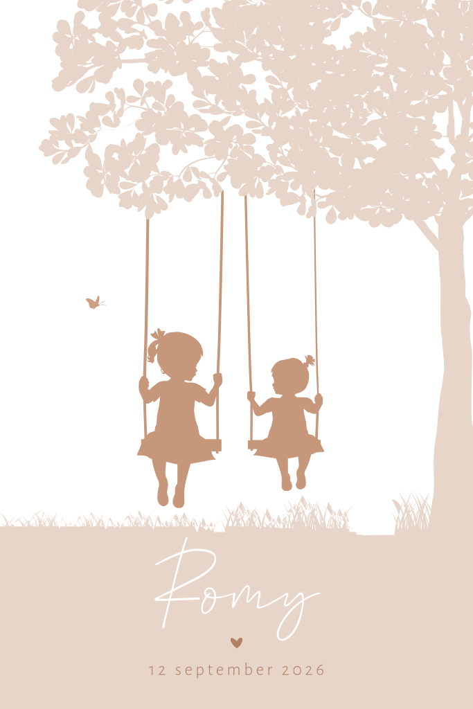 Silhouet geboortekaartje voor een tweede kindje, een dochter. Op dit meisjeskaartje Romy is een grote zus samen met haar kleine zusje aan het schommelen onder een boom. Een lief klein vlindertje fladdert voorbij. Dit kaartje heeft mooie roze terracotta tinten, maar kun je in de editor aanpassen naar je eigen smaak. Dit kaartje kun je ook gebruiken voor een andere gezinssamenstelling.