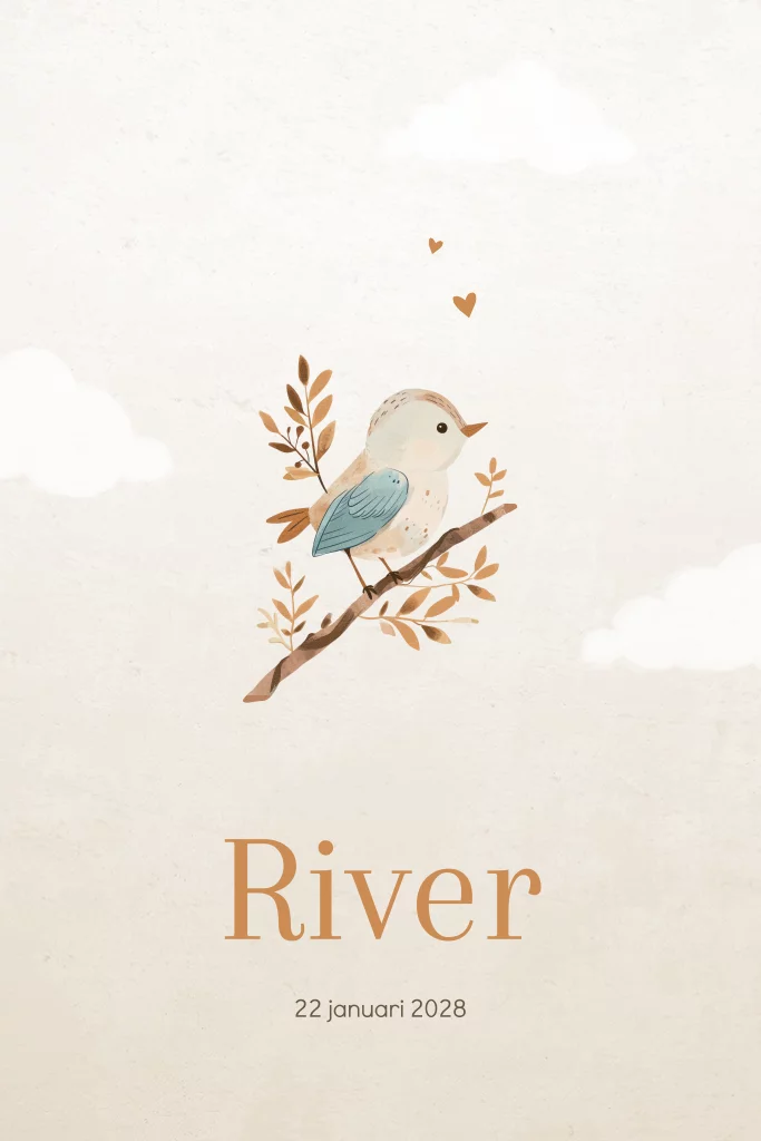 Lief unisex geboortekaartje met schattig vogeltje op een takje. Dit geboortekaartje is voorzien van neutrale beige en bruine kleuren en daardoor geschikt voor zowel een jongen als een meisje. Pas de teksten, kleuren en lettertypes van dit geboortekaartje River eenvoudig aan in de editor.