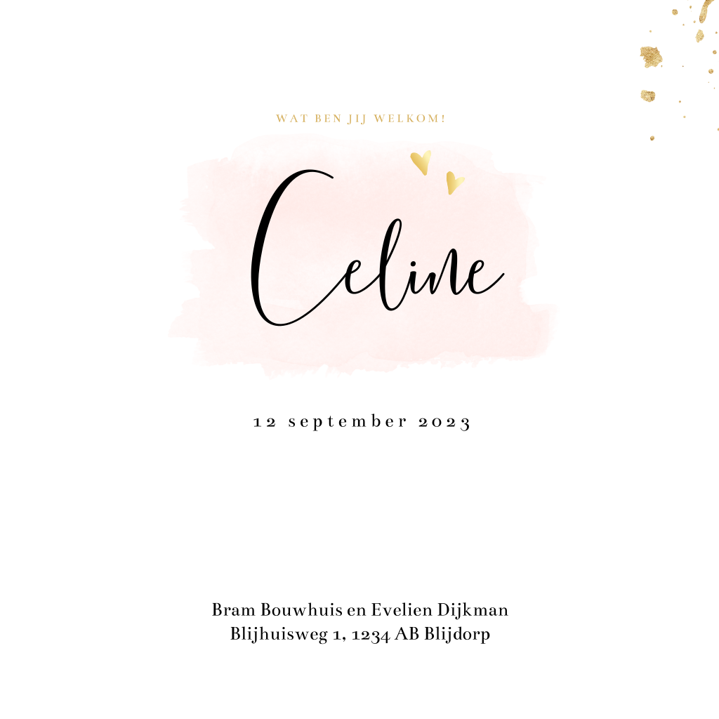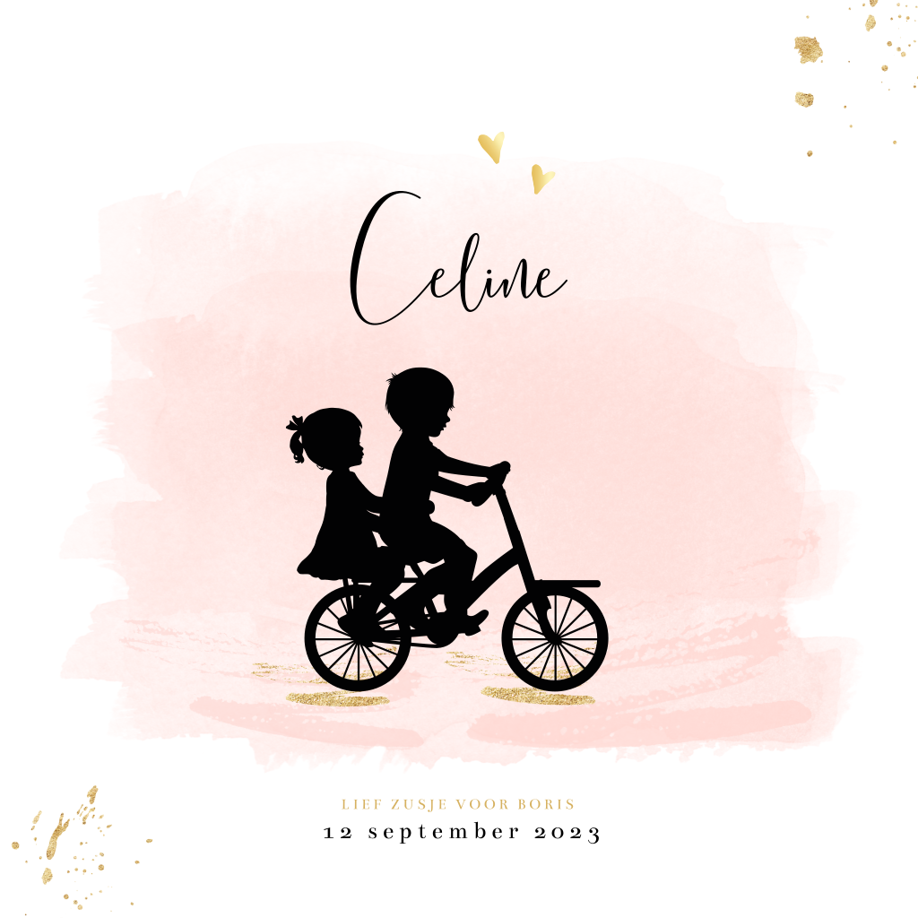 Hip silhouet geboortekaartje voor een tweede kindje, een dochter. Op dit kaartje Celine zie je een grote broer op de fiets met zijn zusje achterop. Op de achtergrond een roze aquarel en enkele gouden accenten, waaronder spetters en kleine hartjes. Op de binnenzijde worden de geboortegegevens weergegeven met symbolen.