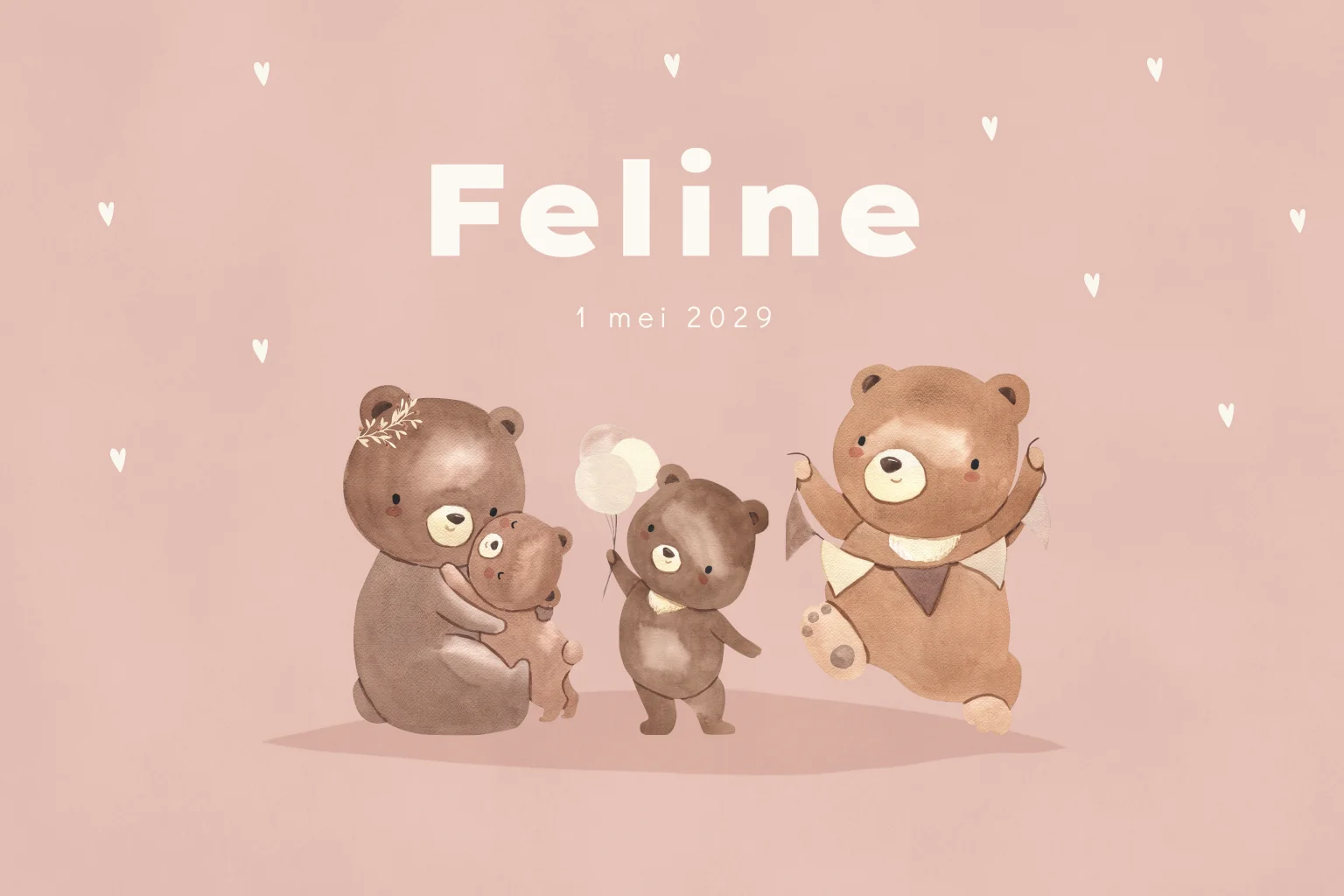 Lief geboortekaartje voor een tweede kindje, een zusje. Op dit geboortekaartje voor een meisje zie je een beren familie die feest viert met slingers en een ballon. Dit babykaartje Jaimy heeft een roze achtergrond met witte hartjes.
